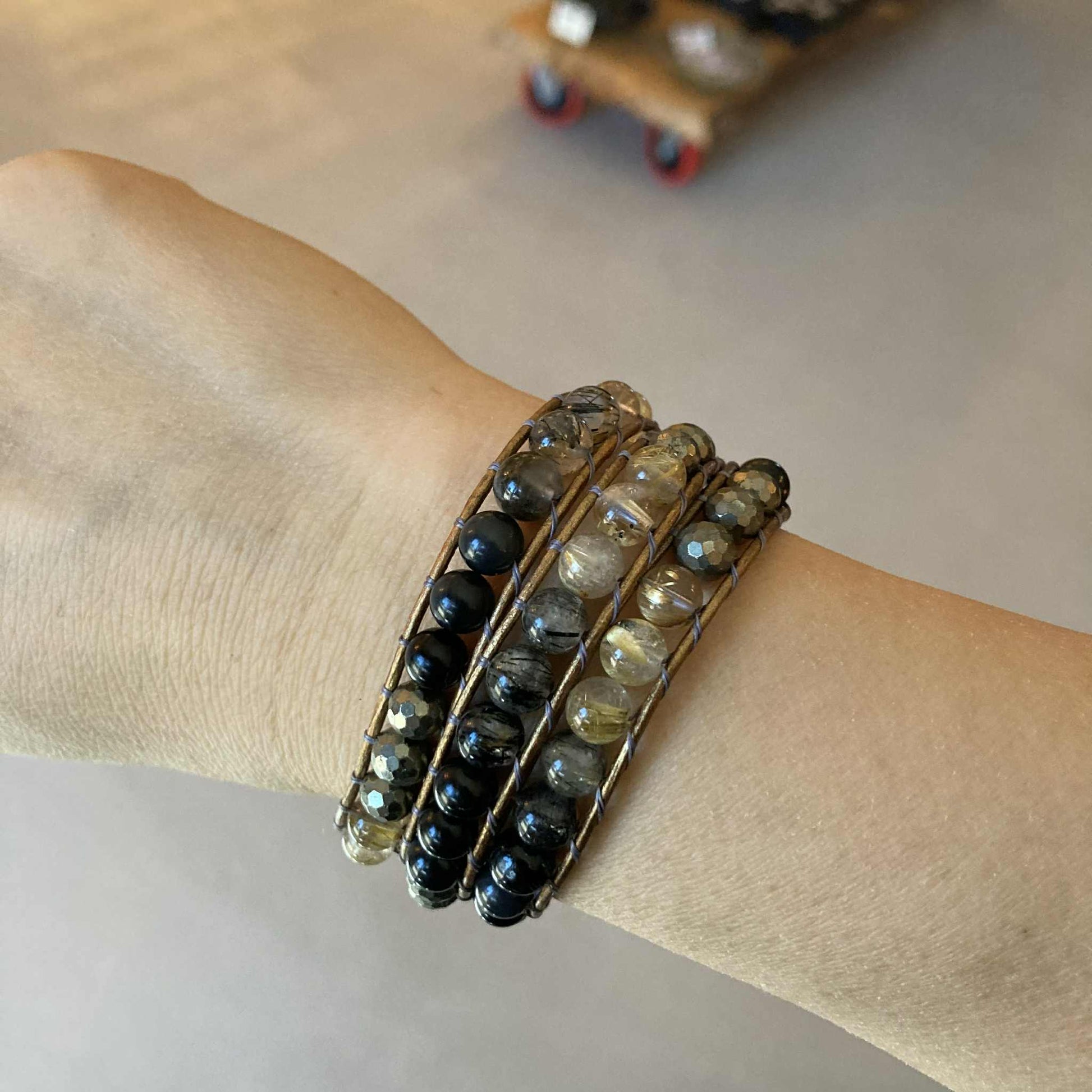 In this bracelet: Rainbow Obsidian | Black Rutilated Quartz | Gold Rutilated Quartz | Faceted Pyrite | 1940's Vintage Czech Glass Button | Leather Cord (lead free dyes)